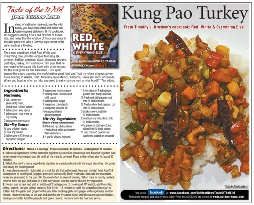 Instead of calling for take-out, use the wild turkey you have harvested and make this Asian-inspired dish from Tim’s cookbook. He suggests serving it on a bed of white or brown rice, and notes that the infusion of flavor and spice in the dish pairs well with a German-style sweet white wine, such as a Riesling.