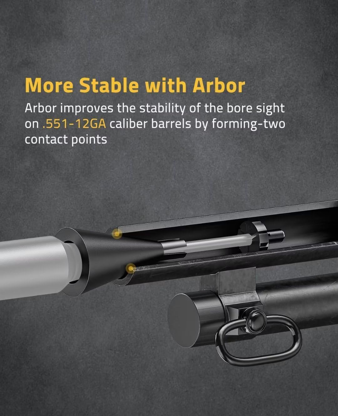 [Arbor Accessories]: Our laser bore sighter is come with an arbor as an auxiliary tool. For .551-12GA caliber, installing the arbor can expand the diameter of the boresighter’s rear end, allowing the entire bore sight to fit better at the muzzle of .551-12GA calibers, thereby improving stability.