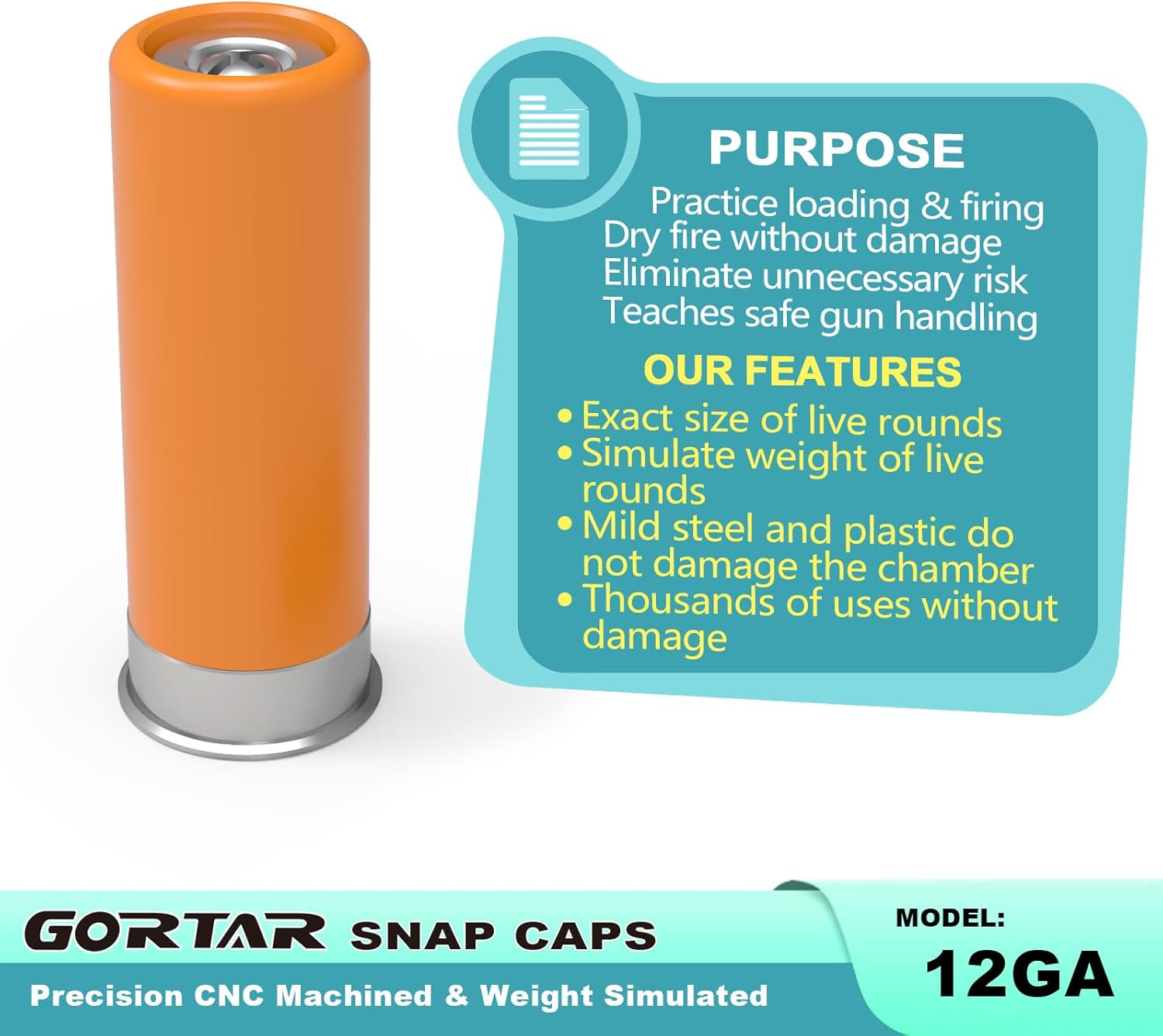 Gortar training snap caps are designed for classroom training, loading/reloading drills, handling drills, malfunction drills and diagnosing shooting problems, and safe storage.