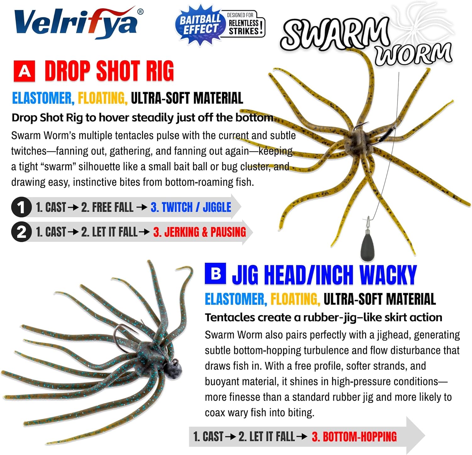 Velrifya’s Swarm Worm Finesse Soft Plastic Baits feature a unique dice-style body with multiple soft tentacles, inspired by Japanese finesse design for pressured bass.