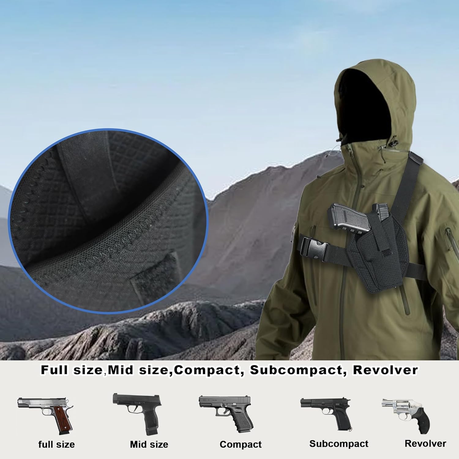 Made with heavy-duty nylon material and reinforced stitching for lasting performance in outdoor conditionsSoft shoulder straps and lightweight holster ensure comfortable all-day wear during outdoor activitiesThis holster accommodates various pistol sizes and models, making it a versatile choice for your outdoor carry needs