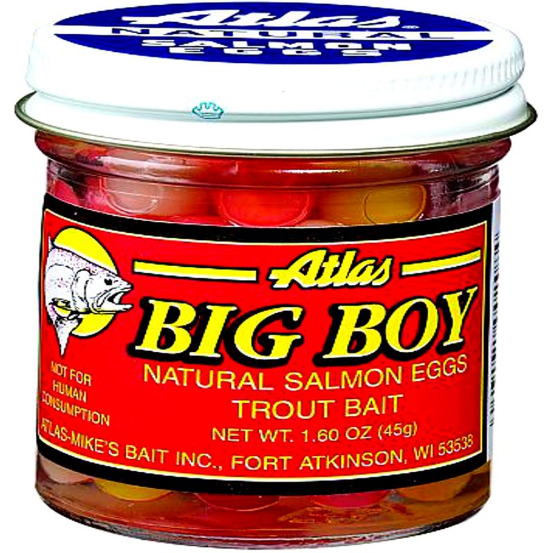 Trout will love the salmon flavor of the Atlas Big Boy 1.6 oz. Assorted Salmon Eggs, which feature a texture that is soft enough to entice bites but firm enough to stay on your hook in fast currents. The eggs come in an oil-packed jar for long life. Atlas Big Boy 1.6 oz. Assorted Salmon Eggs – Frsh Wtr Panfish Bait at Academy Sports