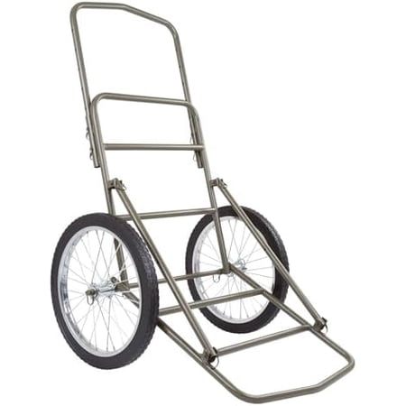 Save the back pain and strain of trying to drag trophy game out of the woods on a sled. Heavy duty hunting cart for transporting trophy game weighing up to 750 lbs great for hauling bear elk or that long anticipated 35-point buck. The HD game cart includes (2) buckle straps to secure game and features gusset-reinforced side supports to keep game stable and secured while transporting. Made with a heavy duty steel axle 20 x 1.75 solid rubber tires steel rims steel spokes and a steel tube frame. Quick wire-spring assembly does not require tools. Folds compact for storage between uses. Includes (2) buckle straps. Finished in a durable dark hunter brown. Heavy Duty game cart specifications: Game hauling platform base measures 26 L x 23.5 W while the upright platform measures 26.5 L x 23.5 W and the top handle is adjustable up to 14.5 long with rounded push-pull grip end. The length from handle edge to base platform edge measures 60 diagonal. Folds compact with wheels removed to 31 L x 28 W x 8 H for storage. 750 LB. LOAD CAPACITY: High-strength steel construction supports up to 750 lbs.; cart easily handles larger game like bear or elk; side braces on the frame and two included straps keep loads securely in place 20″ RUBBER WHEELS: Two 20 solid rubber wheels make it easy to travel through the woods or over rough terrain with this game car; the large wheel size and rubber traction facilitate travel on different terrain like gravel grass sand and more ERGONOMIC HANDLE: 21.5″ W Ergonomic handle is designed to be comfortable to move around and reduce fatigue; adjusts up to 14.5″ so you can customize to the height that works best for you and eliminate the strain on your back MULTIPLE USES: Ideal for hunting season; in addition to hauling game use to move tree stands trail cameras and other hunting gear; also suitable for camping fishing hauling firewood and other items EASY ASSEMBLY: This hunting cart assembles easily with the included wire spring pins; when not in use the wheels and side braces can be removed to easily fold the cart for compact storage in vehicles garages and sheds