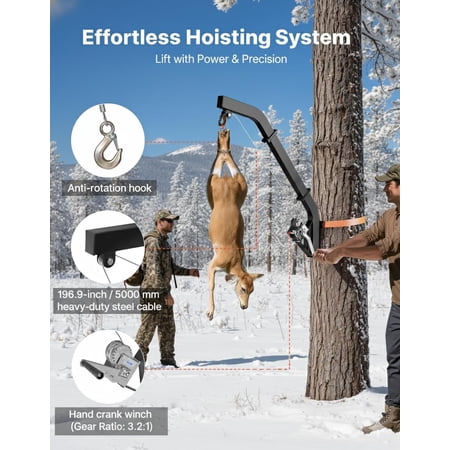 Heavy Duty Construction & 500 lbs Capacity: Made of high-strength hardened carbon steel with black powder coat finish to resist rust and corrosion; supports up to 500 lbs for large game like deer hogs antelope and elk; also suitable for hanging feeders Effortless Game Lifting: Equipped with heavy-duty manual winch and solid steel hand crank for long-term reliability; rubber non-slip handle ensures comfortable grip and labor-saving operation; comes with 26 ft steel cable and snap hook to adjust hanging height for different-sized game Secure & Stable Design: Features adjustable wide ratchet strap with better grip than traditional chains to prevent slipping and loosening; slide the strap into bracket slot fasten around tree and lock for steady performance in outdoor rugged conditions Easy Installation & Portability: All necessary accessories included for one-person assembly without professional skills; detachable and foldable design allows convenient transport and storage; suitable for both field hunting trips and at-home use Versatile Field Equipment: Ideal for hanging game for skinning and cleaning outdoors; compatible with most gambrel-style hoists (gambrel not included); applicable for deer elk antelope hog and other big game