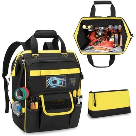 INTERNAL STRUCTURE: The spacious compartment provides ample storage for storing coils wrenches circuit boards cables batteries digital multimeter and other tools. 6 tool slots and large zippered pocket with mesh reinforcement keep tools organized and easily accessible. ACCESSORY POCKETS: 1 separate tool zipper pouch for storing small items like nuts drill bits electrical tape. Front and side pockets allow for flexible storage and tool categorization. Additional tool slots and nylon loops provide further tool organization options. SPECIAL DESIGN: The opening with a rigid steel wire frame to maintain the shape and prevent collapse. The front of the zipper pocket are equipped with magnets super strong magnetism can firmly attract nails screws and other magnetic items. OPTIMIZED DETAILS: Tear-resistant nylon fabric and reinforced stitching enhance durability. Padded waist support and shoulder straps reduce carrying pressure. Tactical styling with laser cut strips for idea innovation. MULTIFUNCTIONAL TOOL STORAGE: Dimensions 12″ L x 6.5″ W x 17.1″ H. tool backpack featuring an integrated tool storage design to meet your tool organization needs. Suitable for electricians craftsmen carpenters HVAC techs and other tool users.