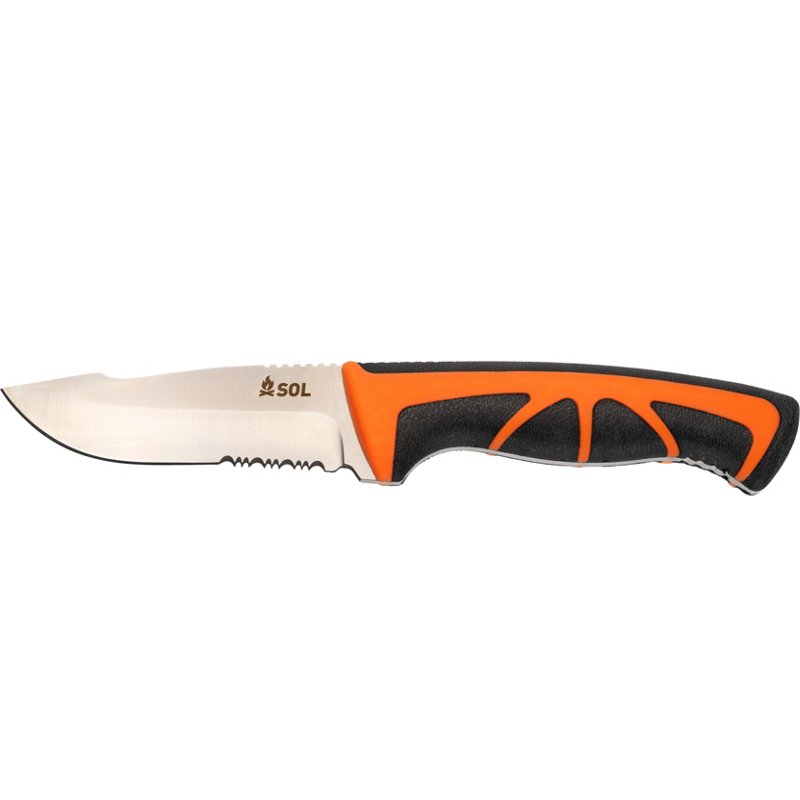 The SOL STOKE Field Knife can handle all your camping, hunting, and hiking adventures. The 3.8-inch knife is made from high-grade 420 stainless steel with a full tang to give this blade the ultimate strength and durability while outdoors. It has a plain edge that is sharp enough for cutting and slicing. Get more out of your survival knife with the included 36 inches of tinder cord and flint fire starter. You will have everything you need for chopping some branches and starting your campfire. The nylon/TPR handle is easy to grip and comfortable to hold. When not in use, the tough riveted holster will cover your blade and protect it while traveling. SOL STOKE Field Knife – Camping Accessories at Academy Sports