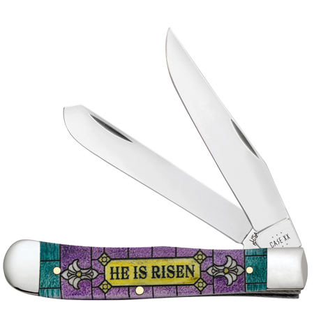 One of Only 350 Made! 2023 Case Xx Easter Knife! This beautiful CASE XX Color-wash Natural Bone Trapper is handcrafted in the U.S.A. and comes with a Limited Lifetime Manufacturer s Warranty. New and never been used or re-sharpened this gorgeous knife is 4 1/8 inches long (folded/closed) and weighs approximately 3.8 ounces. This knife utilizes a 3 1/4 Clip blade and 3 1/4 Spey blade. The blade material is Tru-Sharp Surgical Stainless Steel with Mirror-polished finish. The handle is Color-wash Natural Bone etched with stained glass HE IS RISEN graphic on the front side and stained glass MATTHEW 28:6 graphic on the backside. The bolsters are highly polished Nickel Silver. This knife is presented with a Silver Gift Tin. If you are looking for a great knife to collect carry or give as a gift don t pass this one up! 6254 SS CASE XX 10622 CA10622 TRAPPER WASHED EASTER